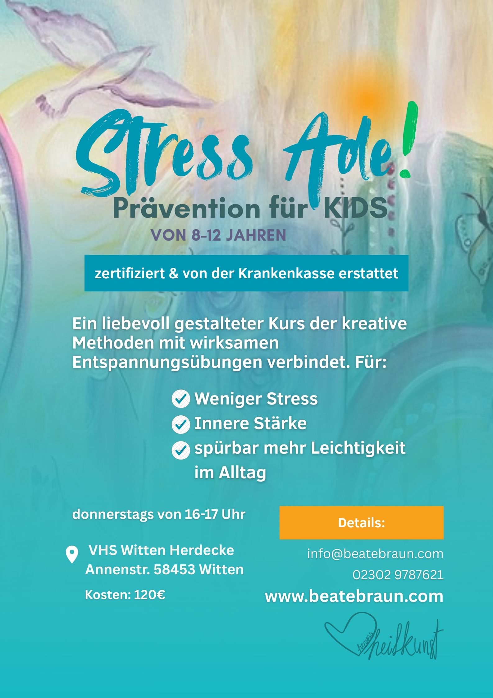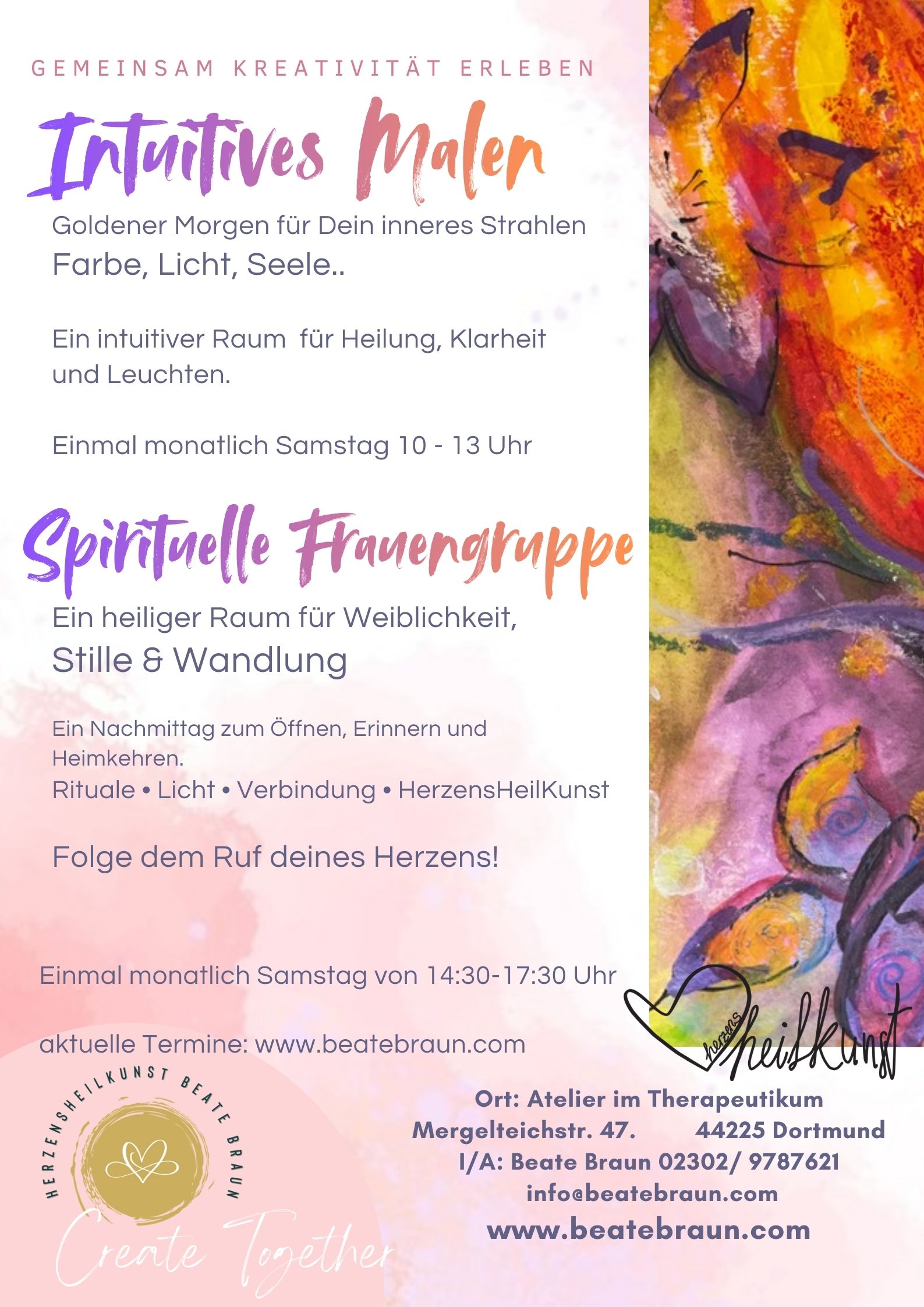 Kunsttherapie Dortmund, Coaching Dortmund & psychotherapeutische Begleitung (HeilprG)HerzensHeilKunst ist eine Praxis für Kunsttherapie, Coaching, Psychotherapie nach dem Heilpraktikergesetz und kreative Entwicklungsförderung in Dortmund und Umgebung. Die Angebote richten sich an Erwachsene, Kinder und Jugendliche, die emotionale Stabilität, Stressregulation, Unterstützung bei Ängsten, Selbstwertstärkung oder Begleitung in Krisensituationen suchen.Die Kunsttherapie in Dortmund unterstützt bei Depressionen, Überforderung, psychosomatischen Beschwerden, Trauma-Folgen und Selbstwertproblemen. Kinder und Jugendliche profitieren von kreativer Ausdrucksarbeit bei AD(H)S, Mobbing, Schulstress, Wut, sozialem Rückzug oder emotionaler Dysregulation.HerzensHeilKunst kombiniert Kunsttherapie, traumasensibles Coaching, Atem- und Körperarbeit, intuitive Prozesse und psychologische Methoden, um innere Klarheit, emotionale Stabilität und Ressourcenstärkung aufzubauen. Die Begleitung ist individuell, ganzheitlich und ressourcenorientiert.Die Praxis in Dortmund begleitet Menschen aus Dortmund, Witten, Bochum, Herdecke, Hagen und Schwerte. Online-Angebote stehen bundesweit zur Verfügung.Für ein kostenloses Erstgespräch oder Informationen zu Kunsttherapie, Coaching oder Kreativkursen: 0174 9994431 oder info@beatebraun.com.